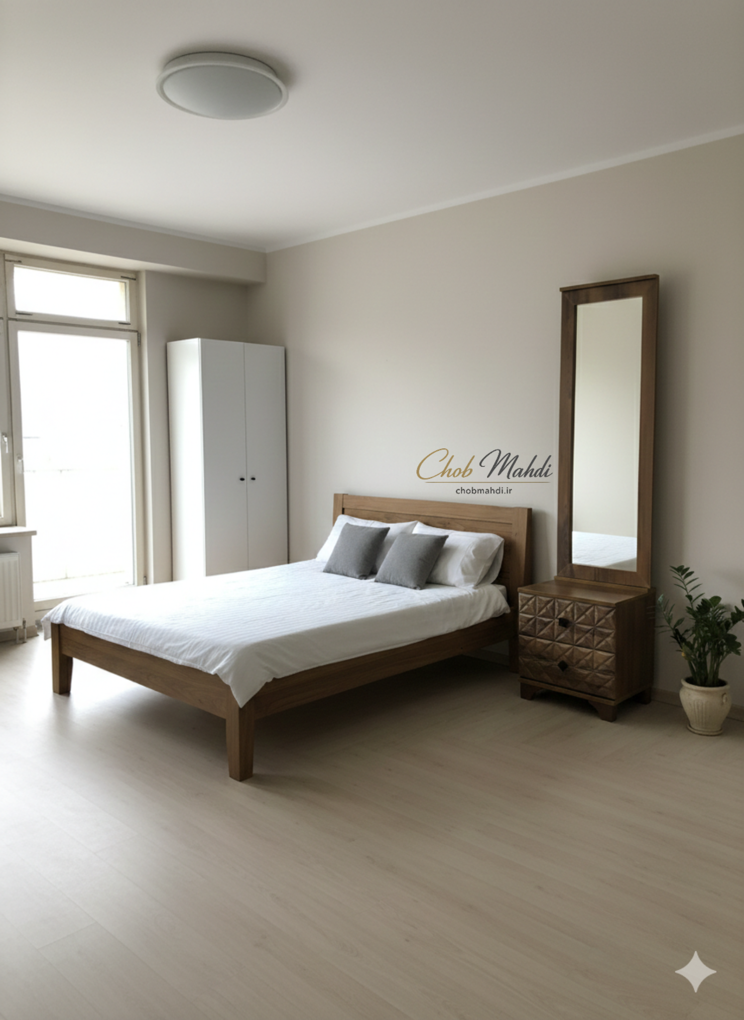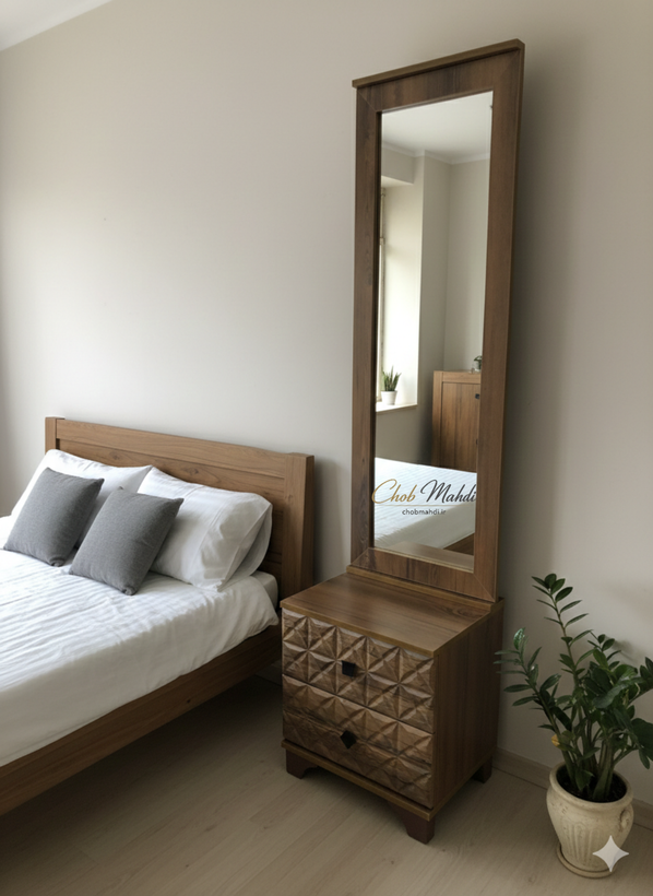 آینه قدی متصل به پاتختی علاوه بر کاربردی بودن، باعث بزرگتر دیده شدن فضا و انعکاس نور طبیعی در اتاق میشود. رنگ قهوهای طبیعی چوب بهراحتی با سرویس خوابهای مدرن، کلاسیک و حتی دکوراسیونهای مینیمال هماهنگ میشود.