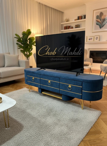 میز تلویزیون مدرن سهکشو پارچه مبلی آبی با پایههای طلایی